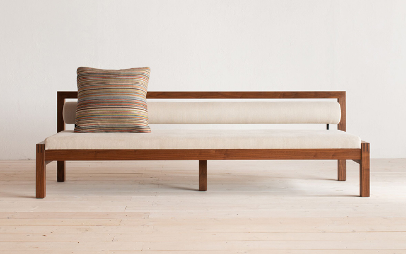 以前デザインした、ある教会の礼拝堂のベンチが原形でミニマルな感じを残しつつ、リゾートのような寛ぎ感が出るようにアレンジしました。座面はフラットでクッションは固めです。ペットと一緒に座るためのベンチとしてお使いになる方もいらっしゃいます。木材のフレームの中に背もたれが浮いたように見えるデザインが特徴です。